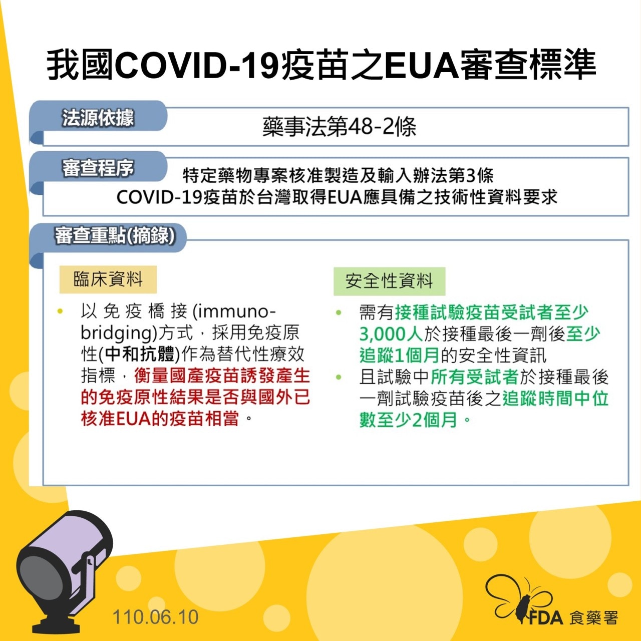 Ecdtxzjwdyjc3m from cdn2.ettoday.net 緊急使用授權(emergency use authorization, eua) 緊急使用授權是一種美國食品藥物管理局(fda)在公共健康遭受危險時提供的特殊授權方式。eua給予fda權限在公共危急造成的cbrn(chemical化學、biological生物、radiological輻、nuclear核能)威脅時,對社會大眾進行的保護措施。 高端新冠疫苗 6 月 15 日向食藥署提出緊急使用授權(eua)申請,食藥署署長吳秀梅 28 日表示,由於高端疫苗仍有技術性文件的資料須補齊,預計 eua 審查期程將會往延到 7 月底,而原本預計 7 月中開打國產疫苗的計畫也將生變。 高端疫苗、聯亞生技兩家國產新冠疫苗廠商,陸續公布二.